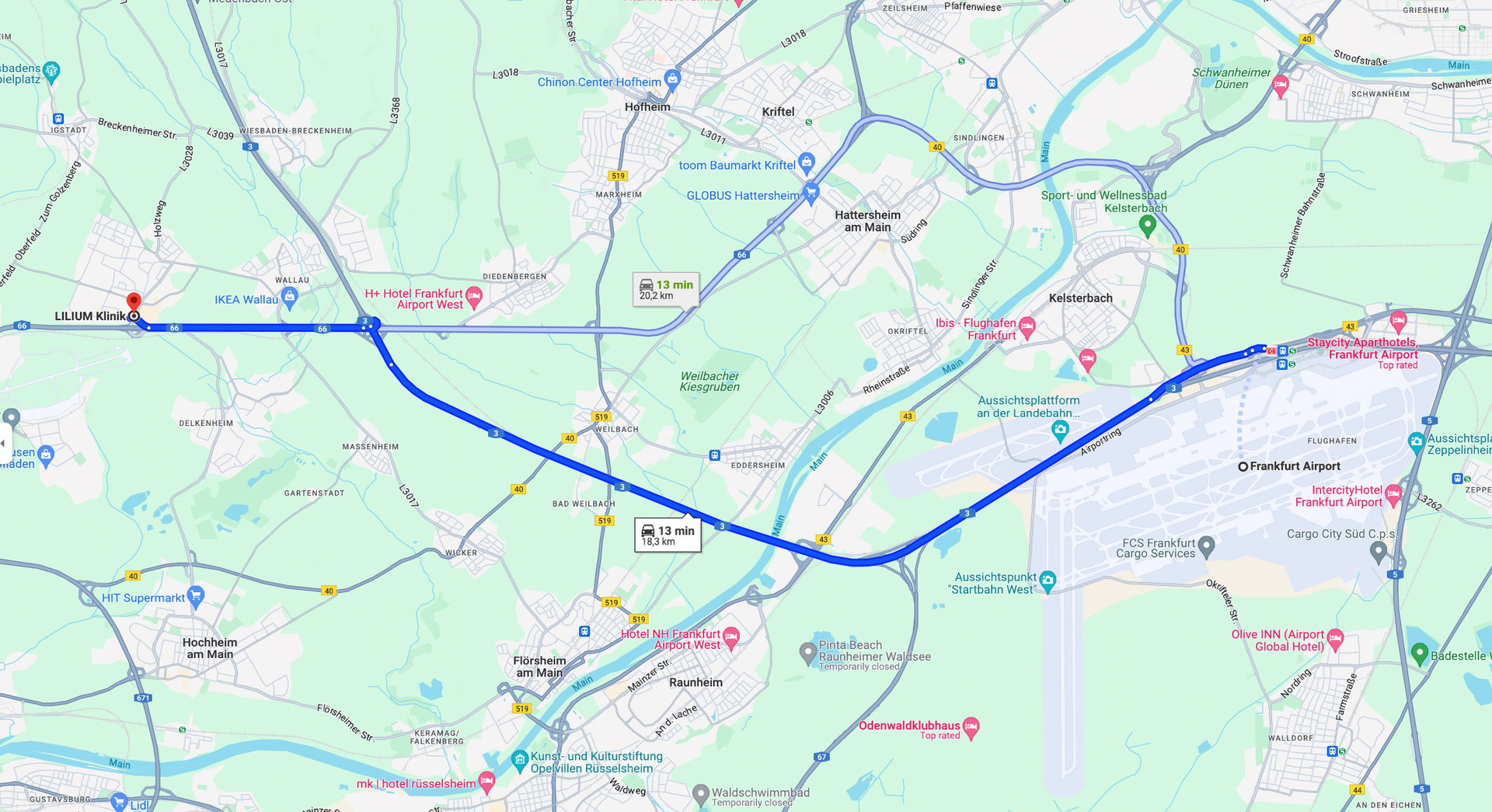 Frankfurt Airport (FRA) is not only the largest commercial airport in Germany, but is located less then 20 kilometers from the lilium-clinic. The fastest connection is by Taxi (about 13 minutes each way).