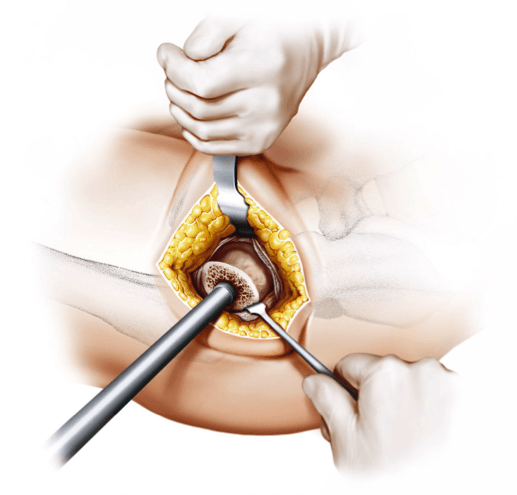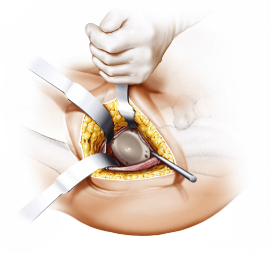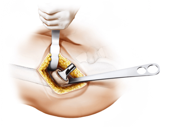 La PROTHÈSE À TIGE COURTE, courte et ronde, s'adapte parfaitement à l'ALMIS ACCESS mini-invasif, sans endommager les muscles ; Contrairement aux tiges droites conventionnelles, l’implantation est réalisée à l’aide de la technique du « tour du coin ».