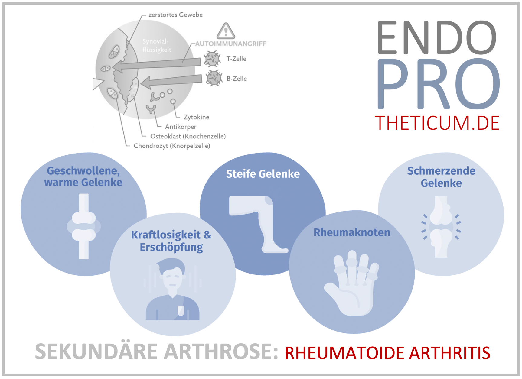 Rheumatoid arthritis is a chronic inflammatory autoimmune disease that leads to the destruction of the synovial membrane, cartilage, and bone. The persistent inflammation leads to severe joint damage over the years. This combination of inflammatory rheumatism and degenerative wear clearly distinguishes secondary osteoarthritis from classic osteoarthritis.